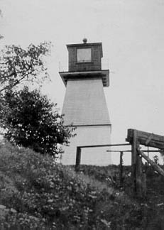 The rear range tower was a detached square, white tower of open frame work showing a fixed white light from a height 41 feet above the tower’s base. The front lights were shown from small, square structures only 6 feet above the base. The source of the light was from a locomotive head light lamp with one wick.