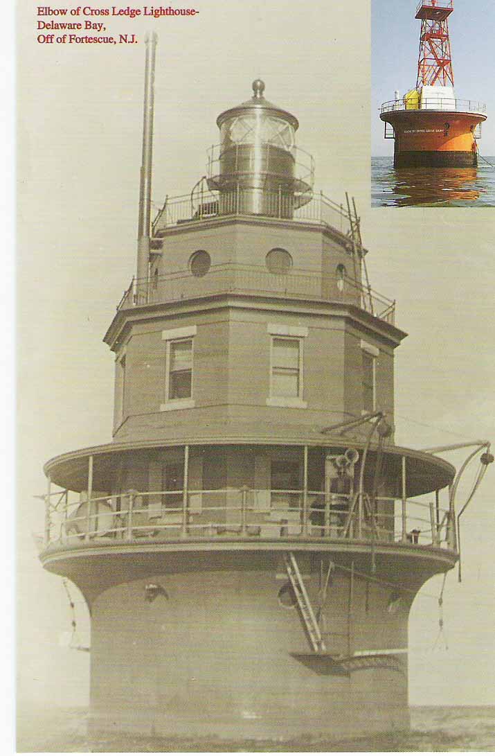 Located off of Fortescue, NJ, Elbow of Cross Ledge was completed and lit in 1910 - and has been described as having a brown lantern on top of a red, octagonal brick dwelling, sitting on top of a brown cylindrical base. During a hurricane in 1951, The Elbow