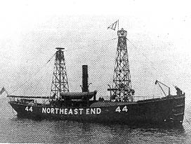 The Northeast End Lightship was built in 1882 by Pussey & Jones in Wilmington, Delaware. She was the first iron lightship built in the United States. The Northeast End vessel was described as: schooner rigged: cagework day-mark surmounted by ball at fore-masthead. Two foremast, red, and one on the mainmast, white, at half-mast high, and lower than red light: (visible) 11 1/2 miles and 10 miles respectively. The fog signal is a 12 inch steam whistle: blasts, 4 seconds: alternate silent intervals, 5 and 107 seconds.